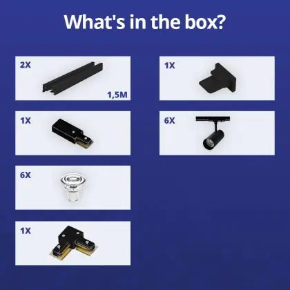 Beschreibung Komplettset 1-Phasen Rail L 1,5 x 1,5 Meter Schwarz | incl. 6x Spot + GU10 2700K 3W Dimmbar + Abschlusskappe, Stromanschluss und L -Verbinder