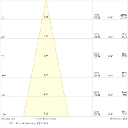 Beispiel: Wird eine Lampe mit einem Abstrahlwinkel von 60 Grad an der Decke (2,5 m Höhe) angebracht, erzeugt sie einen Lichtkegel von 2,9 Metern Durchmesser. Hat die Lampe hingegen einen Abstrahlwinkel von 120 Grad, beträgt der Lichtkegel 8,7 Meter im Durchmesser. |