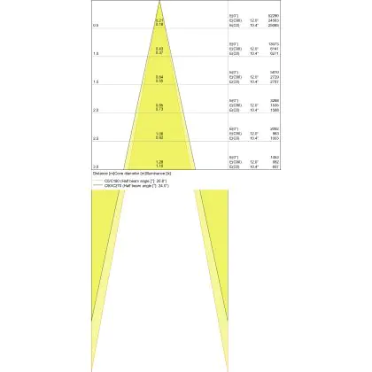 Beispiel: Wird eine Lampe mit einem Abstrahlwinkel von 60 Grad an der Decke (2,5 m Höhe) angebracht, erzeugt sie einen Lichtkegel von 2,9 Metern Durchmesser. Hat die Lampe hingegen einen Abstrahlwinkel von 120 Grad, beträgt der Lichtkegel 8,7 Meter im Durchmesser. |
