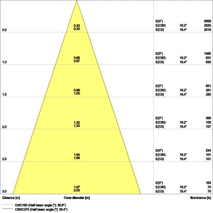 Beispiel: Wird eine Lampe mit einem Abstrahlwinkel von 60 Grad an der Decke (2,5 m Höhe) angebracht, erzeugt sie einen Lichtkegel von 2,9 Metern Durchmesser. Hat die Lampe hingegen einen Abstrahlwinkel von 120 Grad, beträgt der Lichtkegel 8,7 Meter im Durchmesser. |