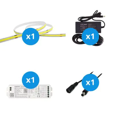 Der große Vorteil dieses Komplettsets ist, dass Sie alles Zubehör haben, das Sie benötigen, um die besten Lichtakzente für Ihr Zuhause oder Ihre Geschäftsräume zu setzen. Sie müssen nicht nach dem richtigen Zubehör suchen, sondern nur alle Elemente miteinander verbinden. Anschließend stecken Sie den Stecker in eine normale Steckdose in Ihrem Haus. Alles dazu erfahren Sie in unserem Installationsblog. Dieses Set enthält: