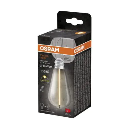 Die Osram Vintage 1906 LED E27 Special Fadenlampe Klar Edison 2.2W 150lm - 827 Extra Warmweiß | Ersatz Für 15W ist eine effiziente E27 LED-Lampe mit Retrodesign und der perfekte Ersatz für Ihre konventionellen 15W Lampen mit E27. Zudem strahlt sie Licht in der Farbtemperatur 2700K - Extra Warmweiß aus und punktet durch eine lange Lebensdauer.