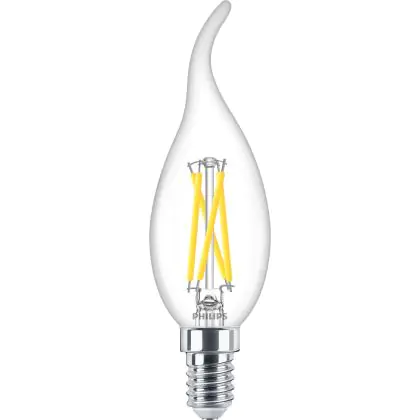 Die Philips MASTER LED E14 Gebogen-tip Kerze Fadenlampe Klar 2.5W 340lm - 922-927 Dim To Warm | Höchste Farbwiedergabe - Dimmbar - Ersatz Für 25W ist eine effiziente E14 LED-Lampe mit Retrodesign und der perfekte Ersatz für Ihre konventionellen 25W Lampen mit E14. Zudem strahlt sie Licht in der Farbtemperatur 2200K - 2700K Dim To Warm aus und punktet durch eine lange Lebensdauer.